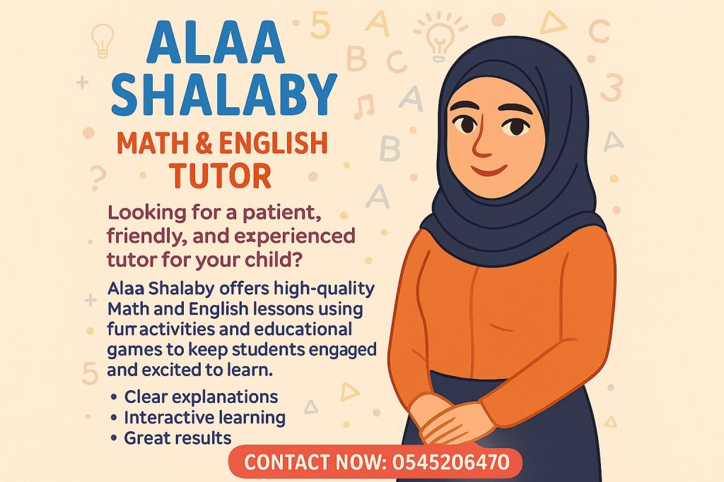 تبحث عن معلمة صبورة وودودة وذات خبرة لطفلك آلاء شلبي تقدم دروس تأسيس رياضيات وانجليزي بطريقة ممتعة تعتمد على الأنشطة التعليمية والألعاب التفاعلية لجعل التعلم أسهل وأكثر متعة. شرح بسيط - تفاعل عالي - نتائج ممتازة للتواصل