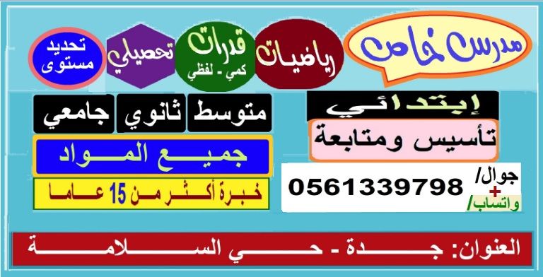 معلم خصوصي رياضيات وجميع المواد لجميع المراحل + قدرات (كمي ولفظي) وتحصيلي + تأسيس ومتابعة لكافة المراحل - تحضيري (رياضيات واحصاء) ويوجد تعليم عن بعد (اونلاين) العنوان جدة - حي السلامة