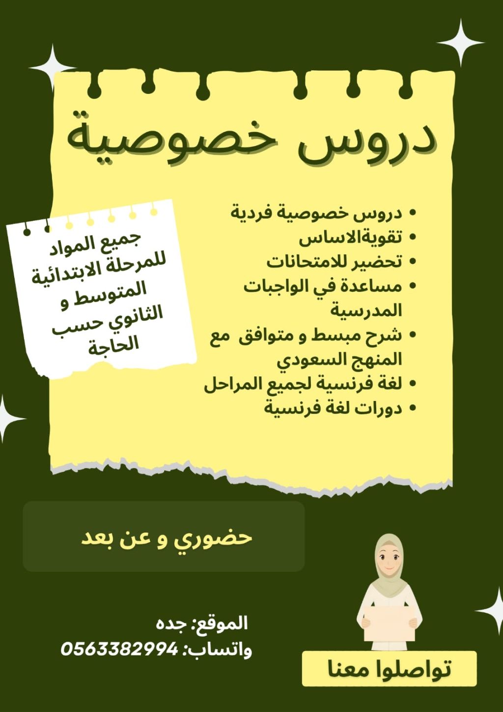 أستاذة أكاديمية مقيمة حاصلة على ماجستير في علم الاجتماع السياسي دروس لجميع الصفوف من الابتدائي حتى الثانوي (وفق المنهج السعودي) تأسيس وشرح بأسلوب مبسط. جميع المواد + اللغة الفرنسية من التأسيس حتى الجامعي - دعم أكاديمي للطلاب الجامعيين تلخيص مقررات جامعية، ارشاد منهجي، تحليل بيانات للطالب، تدقيق وتنسيق ومتابعة واشراف على البحوث الأكاديمية الطلابية حسب نظام أل ApA لمرحلة الإجازة والماجستير