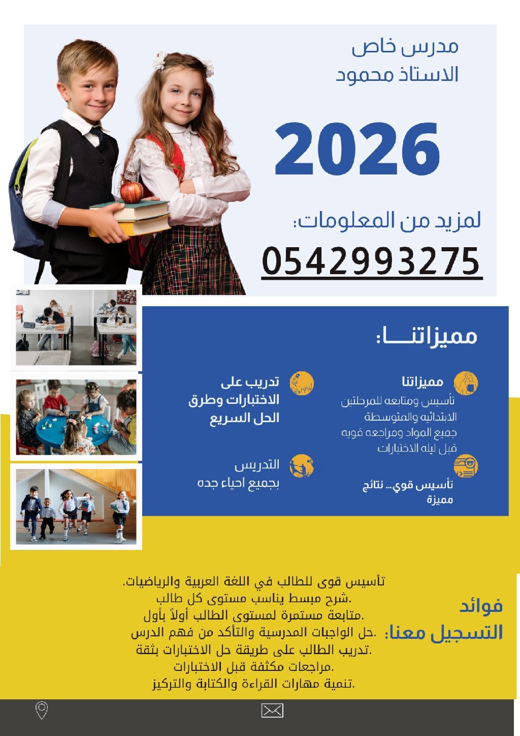 يقدم لكم الأستاذ محمود دروسا خصوصية متميزة للمرحلتين الابتدائية والمتوسطة، مع أسلوب مبسط يساعد الطالب على استيعاب المعلومات بسهولة وبطريقة مشوقة. مميزات الدروس شرح مبسط يناسب مستوى كل طالب تأسيس قوي في القراءة والكتابة والحساب متابعة مستمرة لمستوى الطالب وتطويره تدريب على حل الواجبات والاختبارات مراجعات مكثفة قبل الاختبارات تنمية مهارات الفهم والتركيز لدى الطالب أسلوب هادئ ومحفز يساعد الطالب