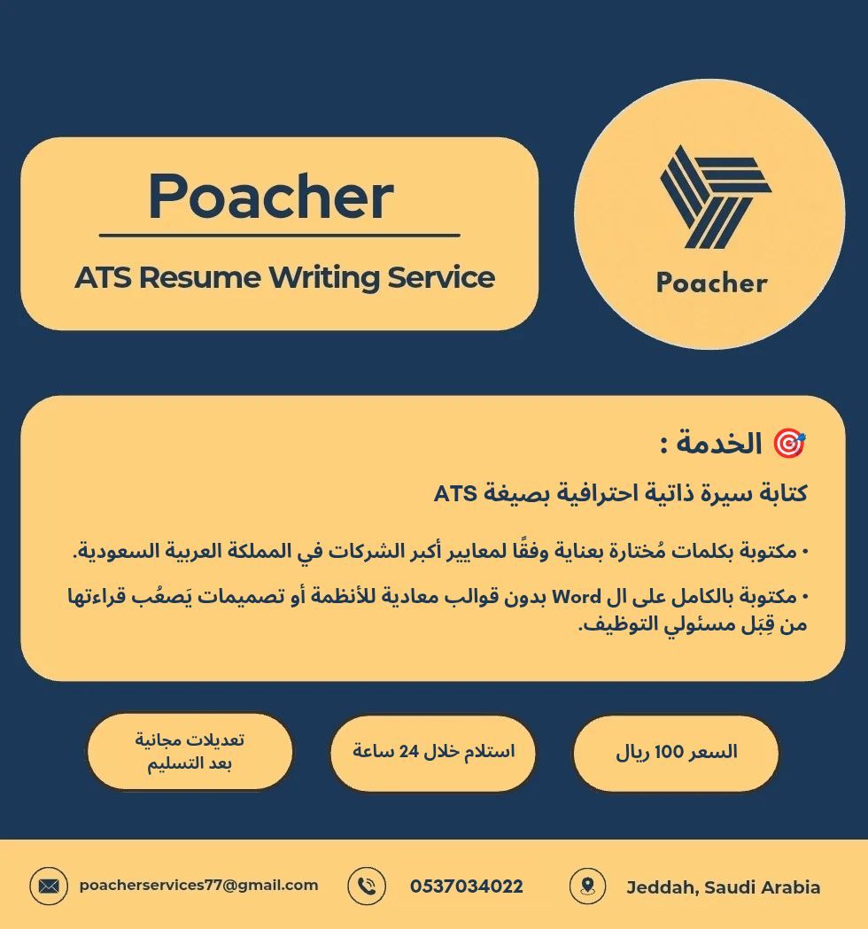 متاح خدمة كتابة سيرة ذاتية بصيغة ATS، تستطيع التغلب على الأنظمة وتوصف خبراتك ومهاراتك جيدا أمام مسؤول التوظيف، كتابة احترافية بالمعايير العالمية، بدون قوالب معقدة ترفضها الأنظمة، استلام خلال 24 ساعة. سعر نسخة عربي أو نسخة انجليزي 100 ريال، سعر نسختين عربي وانجليزي 150 ريال، لطلب الخدمة أو لتفاصيل أكثر أب عتلي رسالة واتساب وهرد عليك في أقرب وقت ممكن