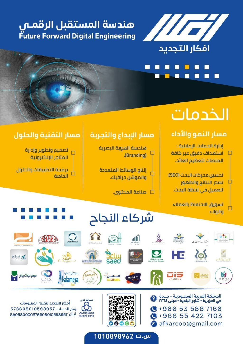 هل تبحث عن نمو حقيقي لمبيعاتك "أفكار للتسويق والتقنية" في جدة تقدم لك حلولا رقمية متكاملة إدارة حملات اعلانية (Google, TikTok, Instagram) تحسين محركات البحث SEO لظهورك أولا. إدارة حسابات التواصل وصناعة المحتوى. تصميم مواقع ومتاجر الكترونية احترافية. نضمن لك استراتيجيات مدروسة ونتائج ملموسة في السوق السعودي. ابدأ نجاحك الرقمي معنا الآن