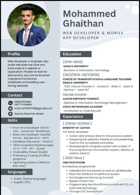مطور ويب وموبايل بخبرة في بناء الأنظمة والتطبيقات باستخدام تقنيات حديثة. اعمل على تطوير الواجهات وتحسين تجربة المستخدم، اضافة الى بناء الأنظمة المعتمدة على الخوادم وقواعد البيانات باستخدام Laravel وASP. NET. كما أطور تطبيقات موبايل متعددة المنصات عبر Flutter، مع تركيز على الأداء والجودة. ابحث عن فرصة أساهم فيها بتقديم حلول تقنية فعالة