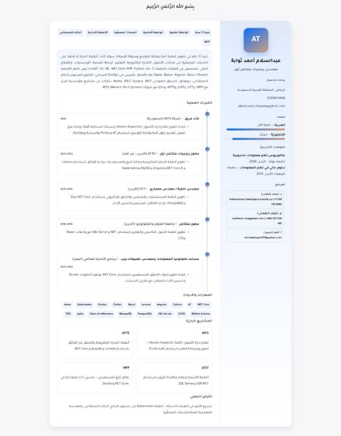 مبرمج نظم ومطور تطبيقات امتلك أكثر من 12 عاما من الخبرة في تطوير أنظمة آمنة وقابلة للتوسع والصيانة (Monolithic & Microservices) في مجالات الأصول، التجارة الالكترونية، التعليم، الرعاية الصحية، اللوجستيات