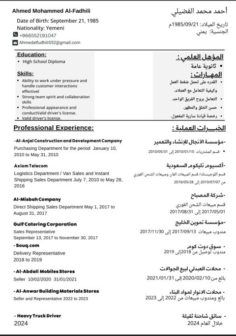 باحث عن عمل في مجال المبيعات عندي مهارات تواصل كويسة وأعرف أتعامل مع العملاء بشكل محترم، وبحاول دايما أحقق أفضل نتيجة في الشغل. ملتزم بالمواعيد أتعلم بسرعة أتحمل ضغط الشغل عندي رغبة حقيقية اشتغل وأطور نفسي بدور على فرصة في شركة محترمة أقدر اشتغل فيها واكسب خبرة وأفيد المكان اللي هكون فيه