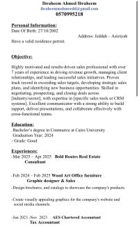 إبراهيم أحمد 22 سنة خريج كلية تجارة جامعة القاهرة 2024. مصري مقيم في جدة لدي خبرة في مجال السيلز والمبيعات ولدي خبرة سنة ونصف في مجال المحاسبه واعمل كجرافيك ديزاينر وأجيد الاوتوكاد