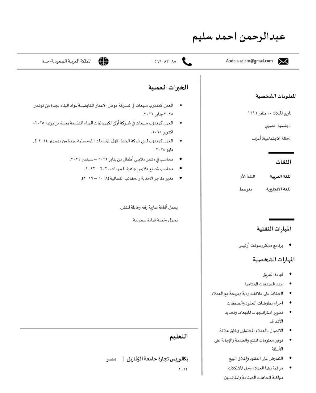 مندوب مبيعات أو مساعد ادري خبرة أكثر من 10 سنة في سوق العمل في مصر وسنة في مدينة جدة