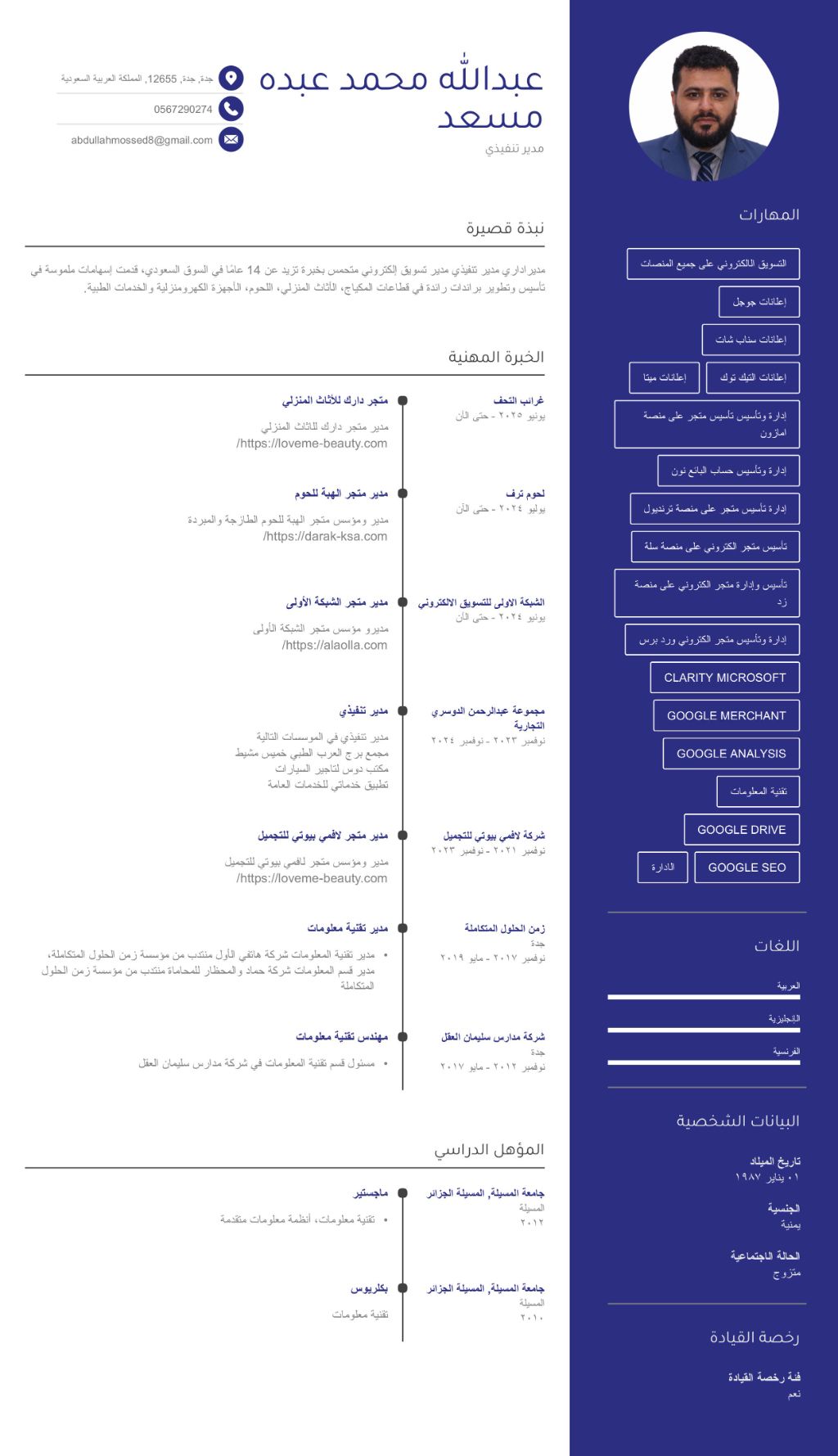 مدير تنفيذي مدير تشغيل مدير تسويق الكتروني انشاء وإدارة متجر الكتروني مدير متجر الكتروني خبرة بجميع منصات السوشيال ميديا ماجستير تقنية معلومات خبرة أكثر من 13 سنة في تكنولوجيا المعلومات والتجارة الالكترونية والتسويق الالكتروني والتسويق في جميع منصات السوشيال ميديا وفي انشاء وتطوير المتاجر الالكترونية وورد برس والعمل على منصات البيع سلة وزد والعمل في منصة البيع متعددة البائعين نون وأمازون وترنديول