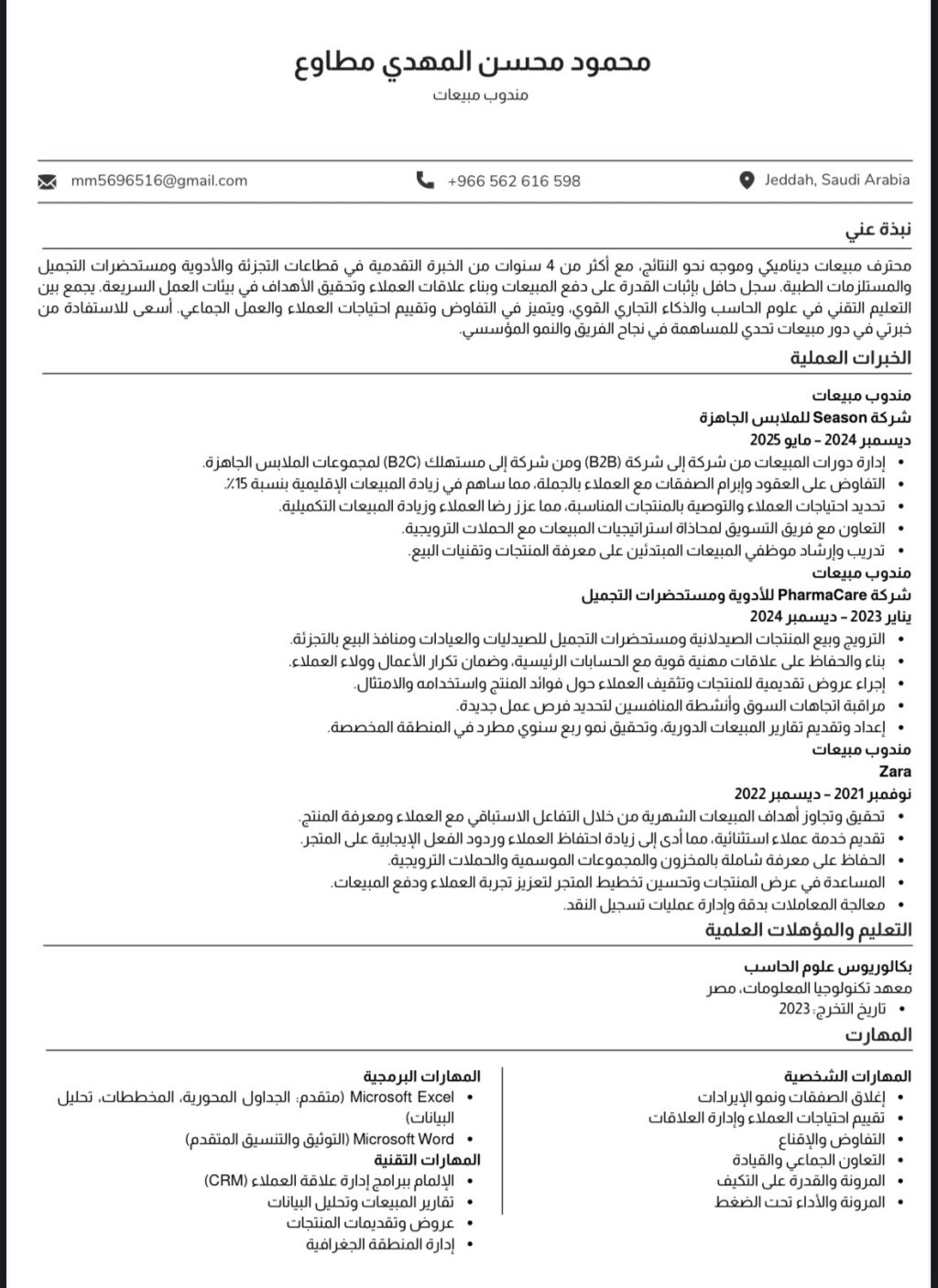 مندوب مبيعات لديه خبرة في التعامل مع العملاء، التسويق الميداني، وتحقيق الأهداف البيعية. أجيد بناء علاقات جيدة مع العملاء، المتابعة المستمرة، وتنظيم خطط الزيارات، مع القدرة على العمل تحت ضغط وتحقيق نتائج