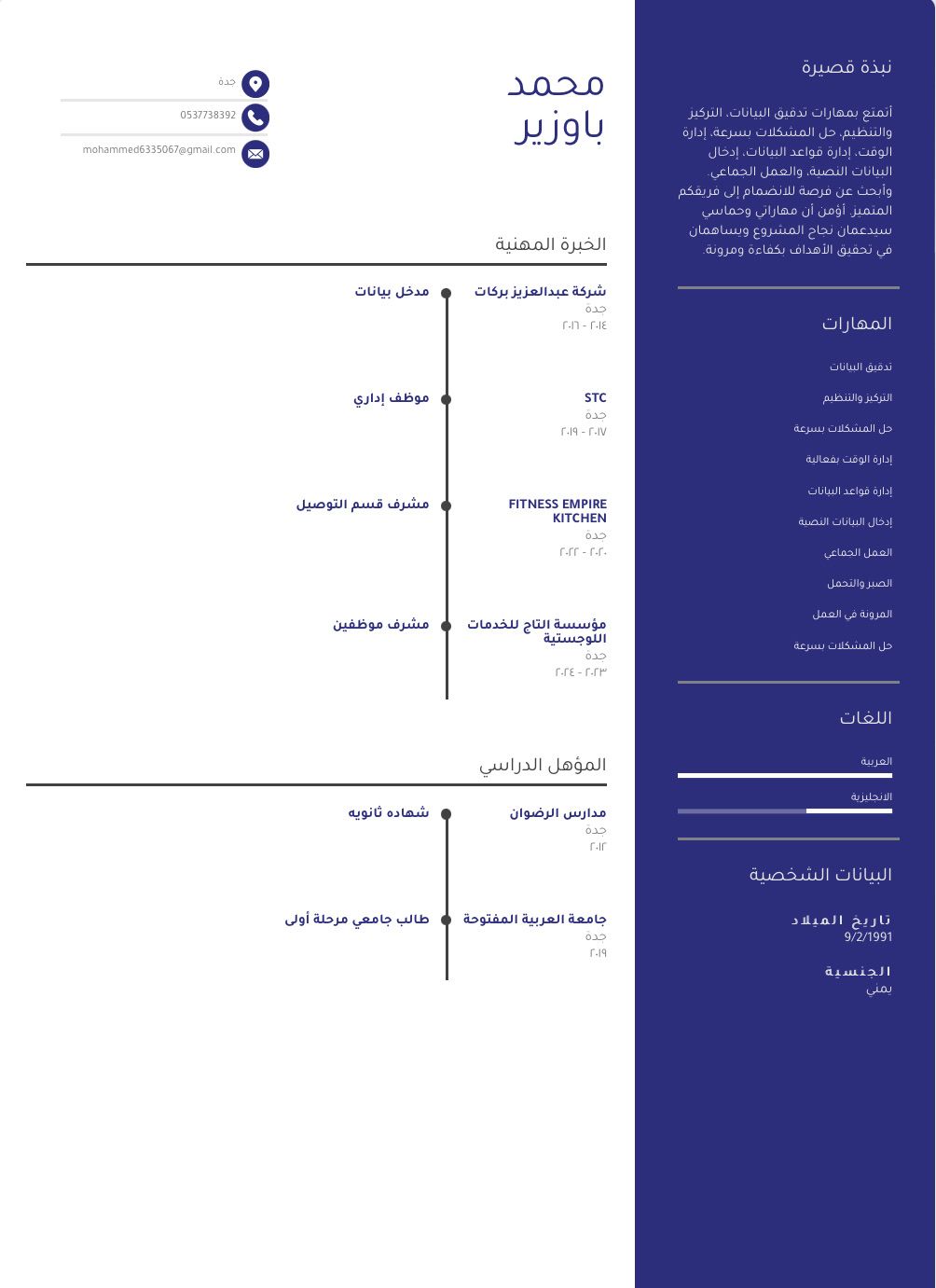 مشرف خدمات لوجستية أتمتع بمهارات تدقيق البيانات، التركيز والتنظيم، حل المشكلات بسرعة إدارة الوقت، إدارة قواعد البيانات ادخال البيانات النصية والعمل الجماعي. وابحث عن فرصة للانضمام الى فريقكم المتميز. أؤمن أن مهاراتي وحما سي سيد عمان نجاح المشروع ويساهمان في تحقيق الأهداف بكفاءة ومرونة
