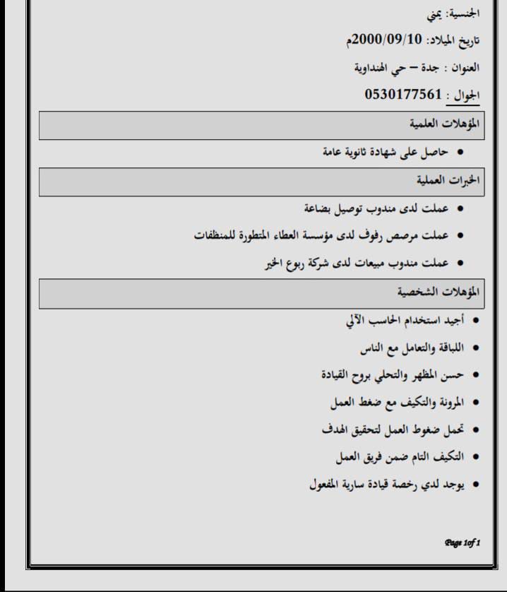 حضرمي أمين ومنضبط في عملي أتحمل ضغط العمل ابحث عن عمل في مدينة جدة حي النخيل العمر 25 سنة لدي رخصة قيادة سارية المفعول لدي 1 - خبرة في المبيعات 2 - موصل بضاعة ومصفف أرفف استلم وتسليم بضاعة 3 - أمين مستودع أجيد استخدام الكمبيوتر المؤهل الدراسي ثانوي 4 - عامل في مستودع ترتيب البضاعة. أتميز بالأمانة والأخلاق الحسنة وابحث عن فرصة أثبت فيها كفاءتي وإخلاصي. رقم
