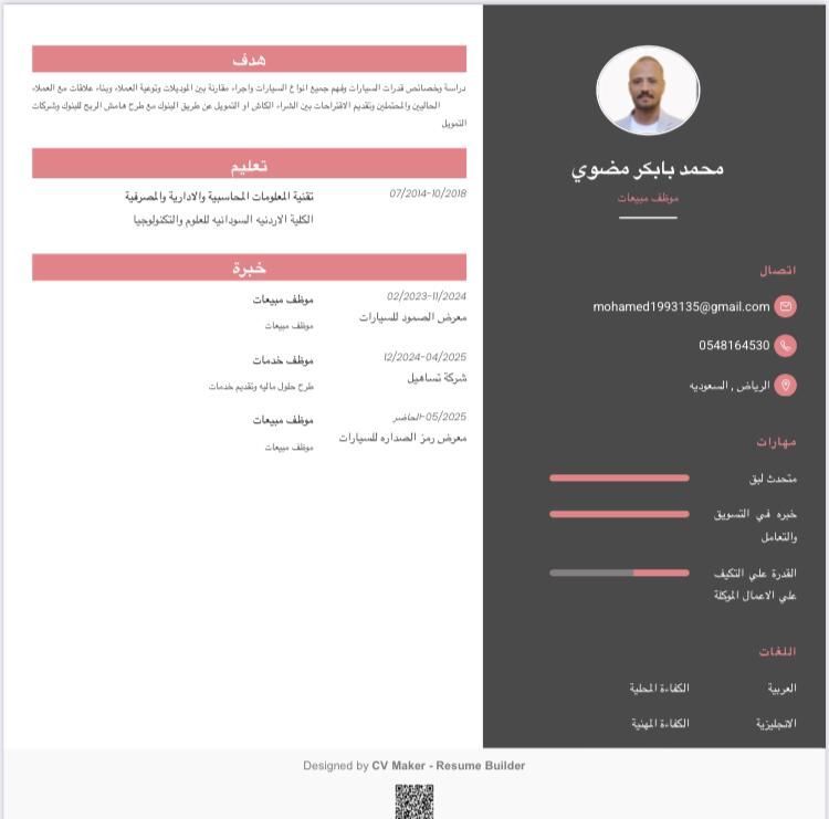 شاب سوداني ابحث عن فرصة عمل في مجال مبيعات السيارات بمدينة جدة. امتلك خبرة قوية ومثبتة بالأرقام في مبيعات السيارات ومعرفة واسعة بسوق السيارات السعودي الخبرات والانجازات خبرة تمتد لأكثر من 4 أعوام في معارض السيارات بمدينة الرياض & amp ndash القادسية. العمل في معرض الصم ود (مرسيدس) وتحقيق مبيعات 146 سيارة خلال عامين. العمل في معرض رمز الصدارة (سيارات تجارية) وتحقيق مبيعات 215 سيارة خلال عامين. ألما