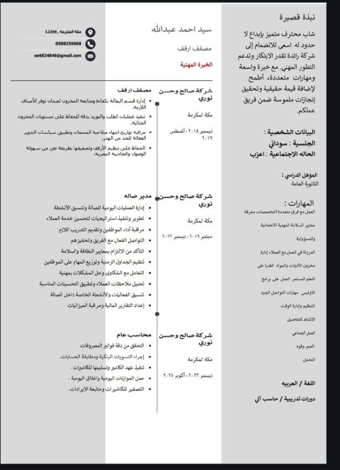 أسعى للعمل في احدى الشركات الكبرى بقسم المبيعات، حيث أتمتع بخبرة في مجال المبيعات، وأجيد العمل الجماعي وخدمة العملاء والتعامل مع المواقف الحرجة في العمل. أجد أن العمل مع فريق عمل محترف يساعد على تحقيق أفضل أداء وأعلى نسبة مبيعات