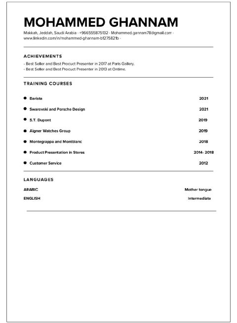 خبرة تزيد عن 15 سنة في مجال المبيعات والتسويق، حيث عملت لمدة 15 سنة في بعض من أفضل الشركات العالمية والأقسام (المبيعات - المخزون) وضمان تحقيق الأهداف والمعايير المطلوبة