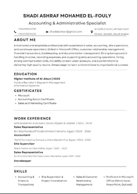 خريج تقنية معلومات ولدي خبرة كبيرة في المبيعات والمحاسبه وادخال البيانات، أستطيع العمل الميداني كمندوب مبيعات أو المكتبي كاشراف والمتابعة، أستطيع تحمل ضغط العمل والعمل في بيئات جديدة وتكوين قاعدة عملاء والتواصل الفعال