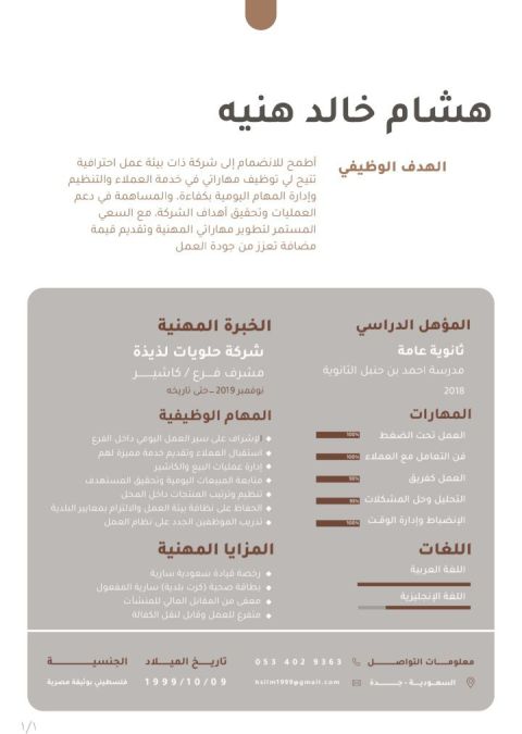 سوداني 34 سنة مقيم في الرياض مدير ومشرف مبيعات وتسويق خبرة في المبيعات والتسويق B2B وB2c أكثر من 10 سنوات وخبرة كبيرة في السوق السعودي متخصص في تحليل السوق وإدارة العلاقات مع العملاء والتفاوض وتحقيق أعلى معدل مبيعات خبرة كبيرة في مجالات مختلفة وإدارة المعارض عملت مدير مبيعات في مصنع وعدة شركات وصنعت الفرق وكنت اضافة حقيقة في زيادة نسبة المبيعات لدي قاعدة عملاء كبيرة