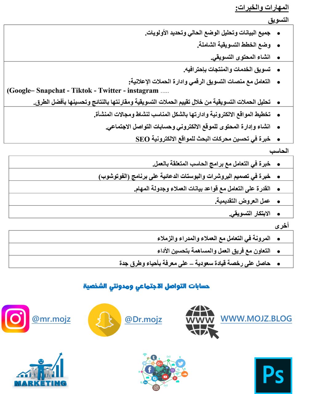 اختصاصي تسويق خبير ومساعد اداري يبحث عن عمل المهارات والخبرات التسويق - جميع البيانات وتحليل الوضع الحالي وتحديد الأولويات. وضع الخطط التسويقية الشاملة. انشاء المحتوى التسويقي. تسويق الخدمات والمنتجات باحترافية. التعامل مع منصات التسويق الرقمي وادارة الحملات الاعلانية Google - Snapchat - Tiktok - Twitter - Instagram. تحليل الحملات التسويقية من خلال تقييم الحملات التسويقية ومقارنتها بالنتائج