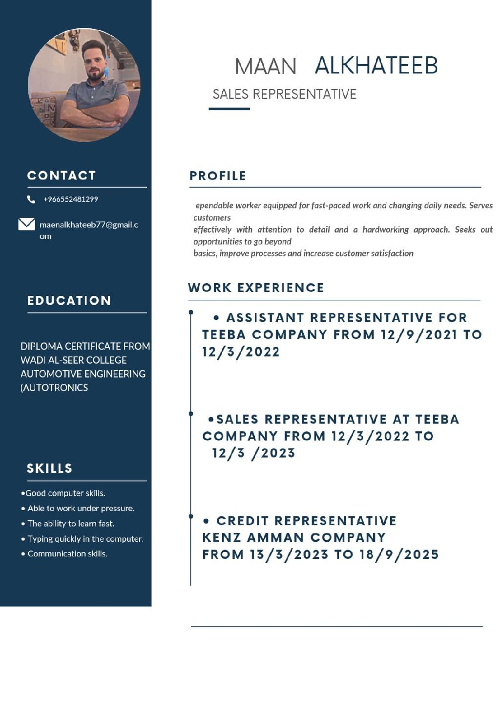 أنا شاب أردني أتيت الى السعودية تأشيرة زيارة وابحث عن وظيفة مندوب مبيعات اتمنى أني القي وظيفة وأنا جاهز للعمل وخبرتي في مجال المبيعات 4 - 5 سنوات وحاصل على شهادة دبلوم هندسة سيارات وإن شاء الله أني القي فرصة عمل بارك الله فيكم