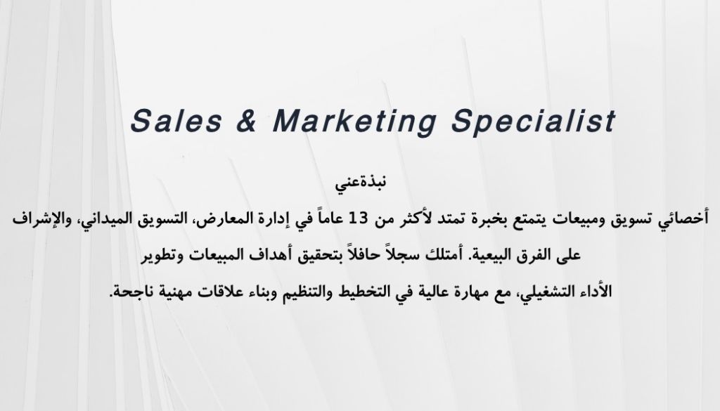 أخصائي تسويق ومبيعات يتمتع بخبرة تمتد لأكثر من 13 عاما في إدارة المعارض، التسويق الميداني، والاشراف على الفرق البيعية. امتلك سجلا حافلا بتحقيق أهداف المبيعات وتطوير الأداء التشغيلي، مع مهارة عالية في التخطيط والتنظيم وبناء علاقات مهنية ناجحة