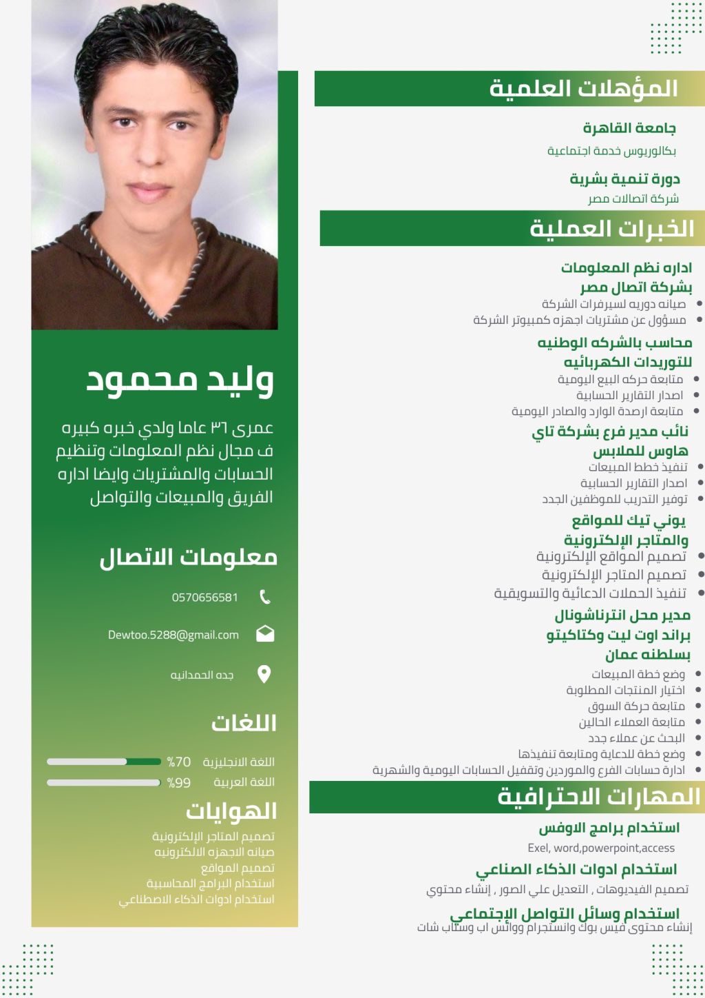 ابحث عن عمل خبرة في مجال المبيعات وخدمة العملاء خبرة في مجال الملابس استخدام برامج المحاسبه والأكسيل خبرة في مجال ادارة المواقع والمتاجر الالكترونية خبرة في التسويق والدعاية استخدام الكمبيوتر والبرامج الحسابيه والدعائيه خبرة في ادارة المتاجر الالكترونية وعمل الحملات الاعلانية خبرة في صيانة الكمبيوتر واللابتوب استخدام أدوات الذكاء الاصطناعي