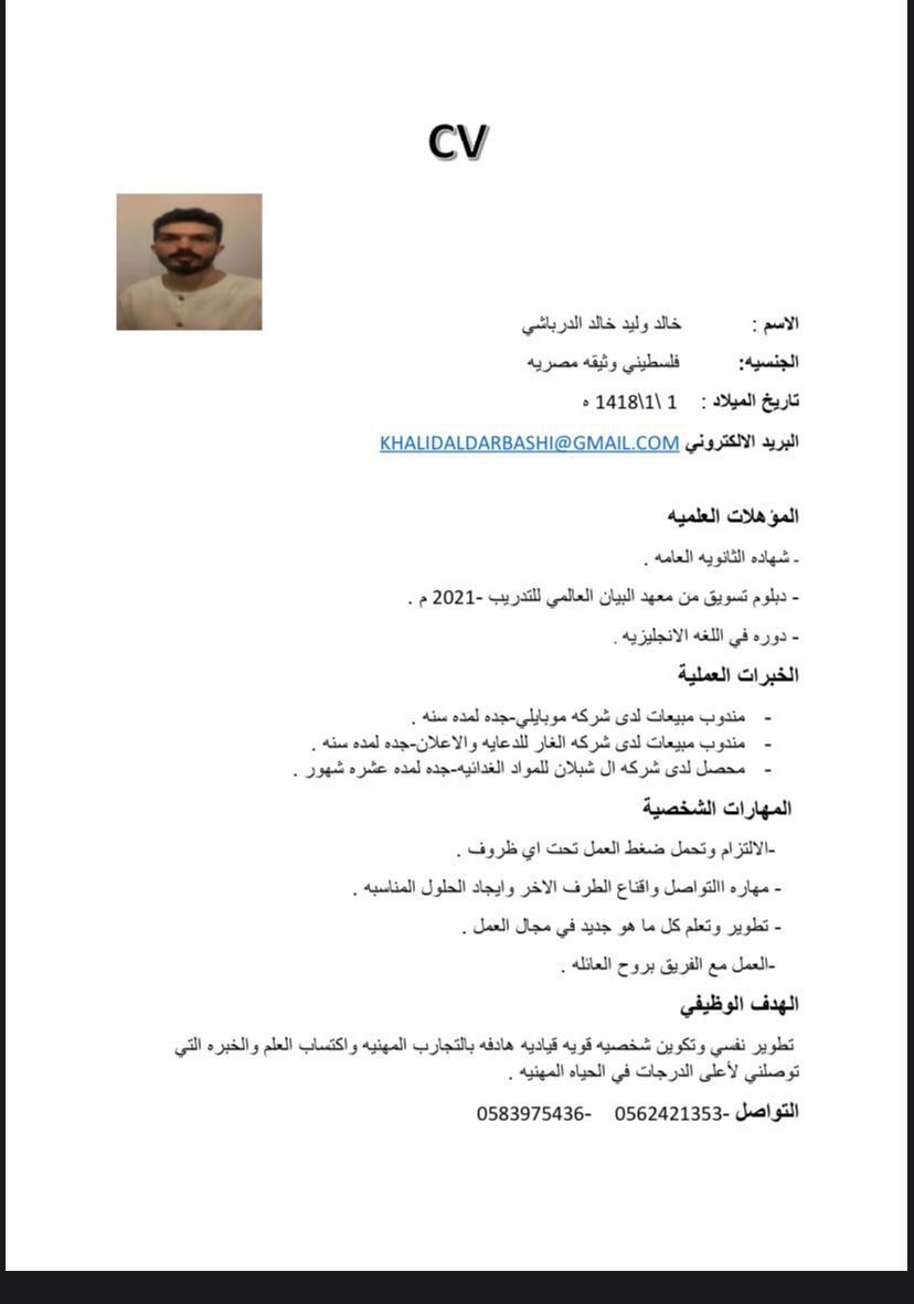 الاسم/ خالد وليد الدربا شيء الجنسية فلسطيني مواليد المملكة العمر / 28 حاصل على دبلوم تسويق وعندي خبرة كبيرة في مجال المبيعات والاعلانات وسبق لي العمل على منتجات كثيره ومتنوعه ولغتي الانجليزية جيده متفرغ من العمل وجاهز لأي عرض