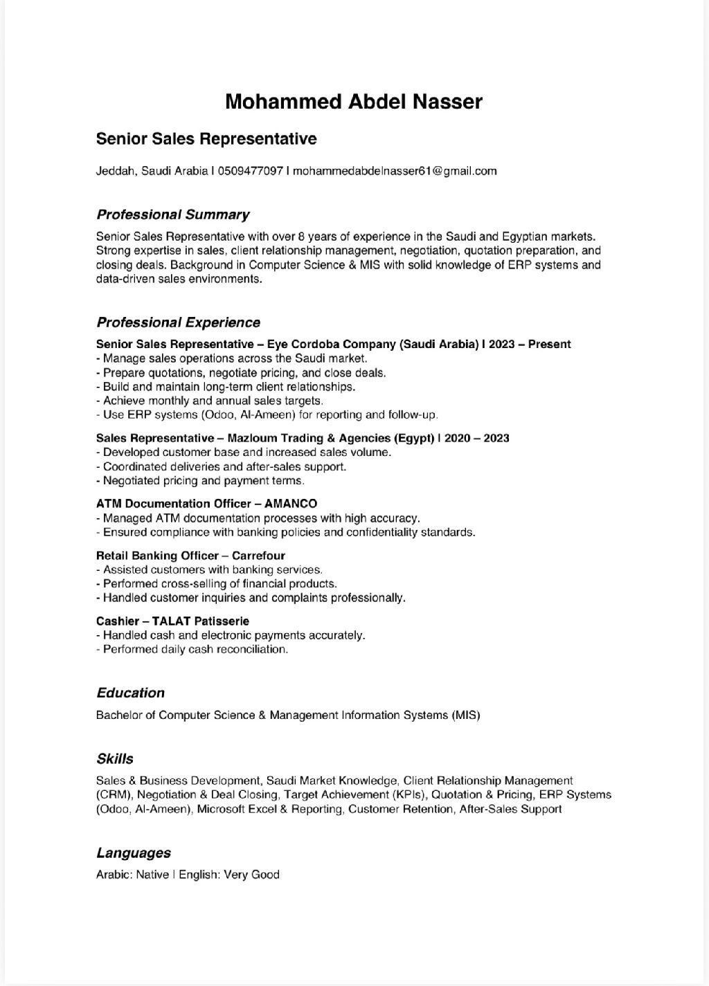 أتقدم لسيادتكم بطلب التوظيف عن وظيفة في مجال المبيعات خبرة تزيد عن 8 سنوات وخدمة العملاء داخل وخارج السوق السعودي ولدى خبرة في إظارة علاقات العملاء وتحقيق أهداف المبيعات وتطوير خطط البيع وزيادة حجم المبيعات امتلك القدرة على قيادة فريق العمل وبناء علاقات قوية مع العملاء وتحقيق نتائج ايجابية للشركة