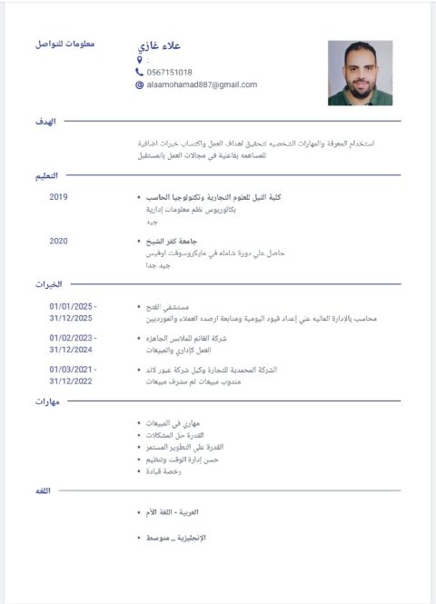 مندوب مبيعات نشيط وله خبرة تزيد عن 5 سنوات في مجال التجزئة والمبيعات، متخصص في تقديم أفضل الخدمات للعملاء وتحقيق الأهداف البيعية. ماهر في بناء العلاقات وتحديد احتياجات العملاء والعمل تحت ضغط مع فرق متنوعة. يمتلك خبرة جيدة في استخدام تطبيقات أوفيس، ولديه رخصة قيادة سارية ومستعد للتنقل حسب متطلبات العمل