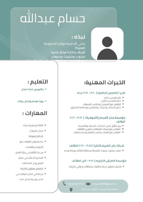 مقيم يمني مواليد السعودية خبرة أكثر من 15 سنة عملت في فتح وتأسيس محلات ومراكز وادارتها وتشغيلها (جوالات - بلاستيك ومنظفات - معسلات - الكترونيات - ملابس - سيارات) وعملت مندوب مشتريات ومبيعات لنفس المجالات