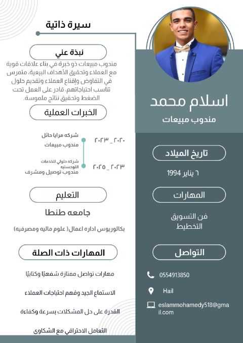 أنا اسلام محمد مقيم في حائل، لدي خبرة في المبيعات وخدمة العملاء والتفاوض وتحقيق الأهداف. عملت في شركات مبيعات ولوجستيات، وامتلك مهارات قوية في التواصل وحل المشكلات والتعامل مع العملاء باحترافية. مؤهل بكالوريوس إدارة أعمال متاح للعمل فورا