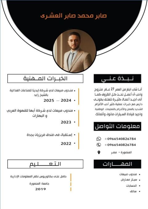 الاسم صابر العشري المهنة مندوب مبيعات معي رخصة سواقة السن 27 مصري الجنسية خبرة في مجال البيع الميداني