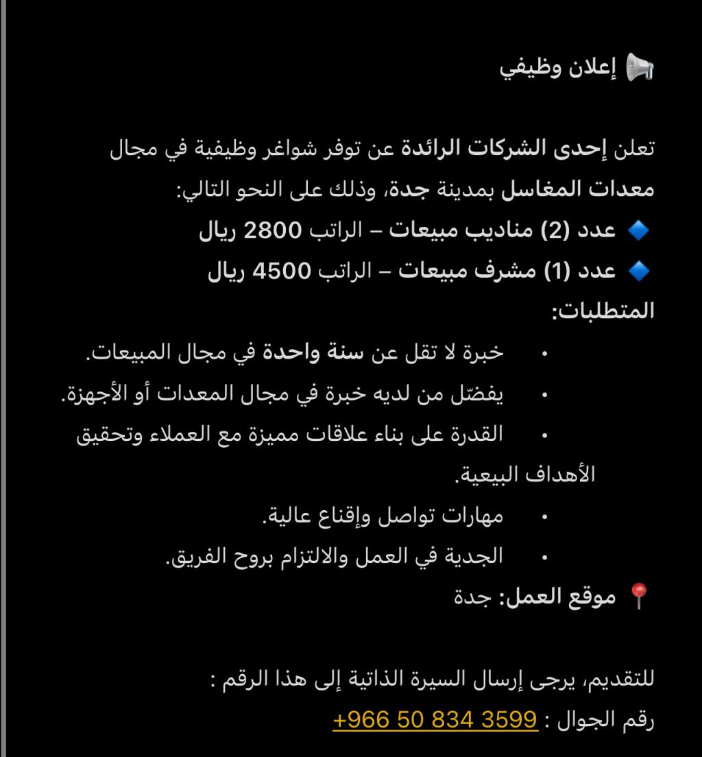 تعلن احدى الشركات الرائدة عن توفر شواغر وظيفية في مجال معدات المغاسل بمدينة جدة، وذلك على النحو التالي مناديب مبيعات - الراتب 2800 ريال مشرف مبيعات - الراتب 4500 ريال المتطلبات خبرة لا تقل عن سنة واحدة في مجال المبيعات موقع المقابلة جدة، البغدادية الغربية
