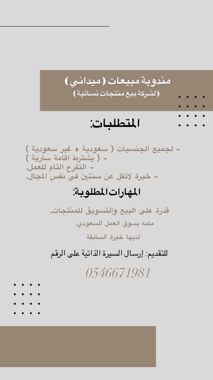 مندوبة مبيعات (ميداني) لشركة بيع منتجات نسائية) المتطلبات / لجميع الجنسيات (سعودية + غير سعودية) يشترط إقامة سارية) التفرع التام للعمل. خبرة لا تقل عن سنتين في نفس المجال. المهارات المطلوبة / قدرة على البيع والتسويق للمنتجات. ملمه بسوق العمل السعودي. الادارة / فرع الحمدانية لديها خبرة السابقة للتقديم إرسال السيرة الذاتية على الرقم