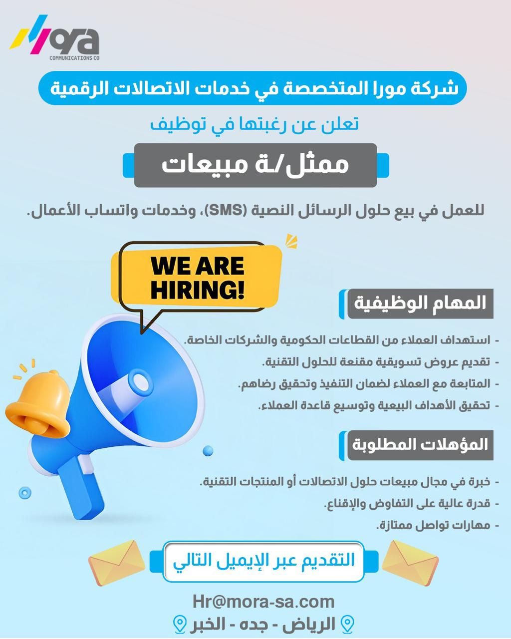 تعلن شركة مورا للاتصالات عن فتح أبواب التقديم لشاغر وظيفي بمسمي مندوب / ة مبيعات العمل باحدي فروعها داخل المملكة العربية السعودية خبرة لا تقل عن سنتين بنفس المجال شرط توفر رخصة قيادة العمل للجنسين التقديم من خلال البريد الألكتروني