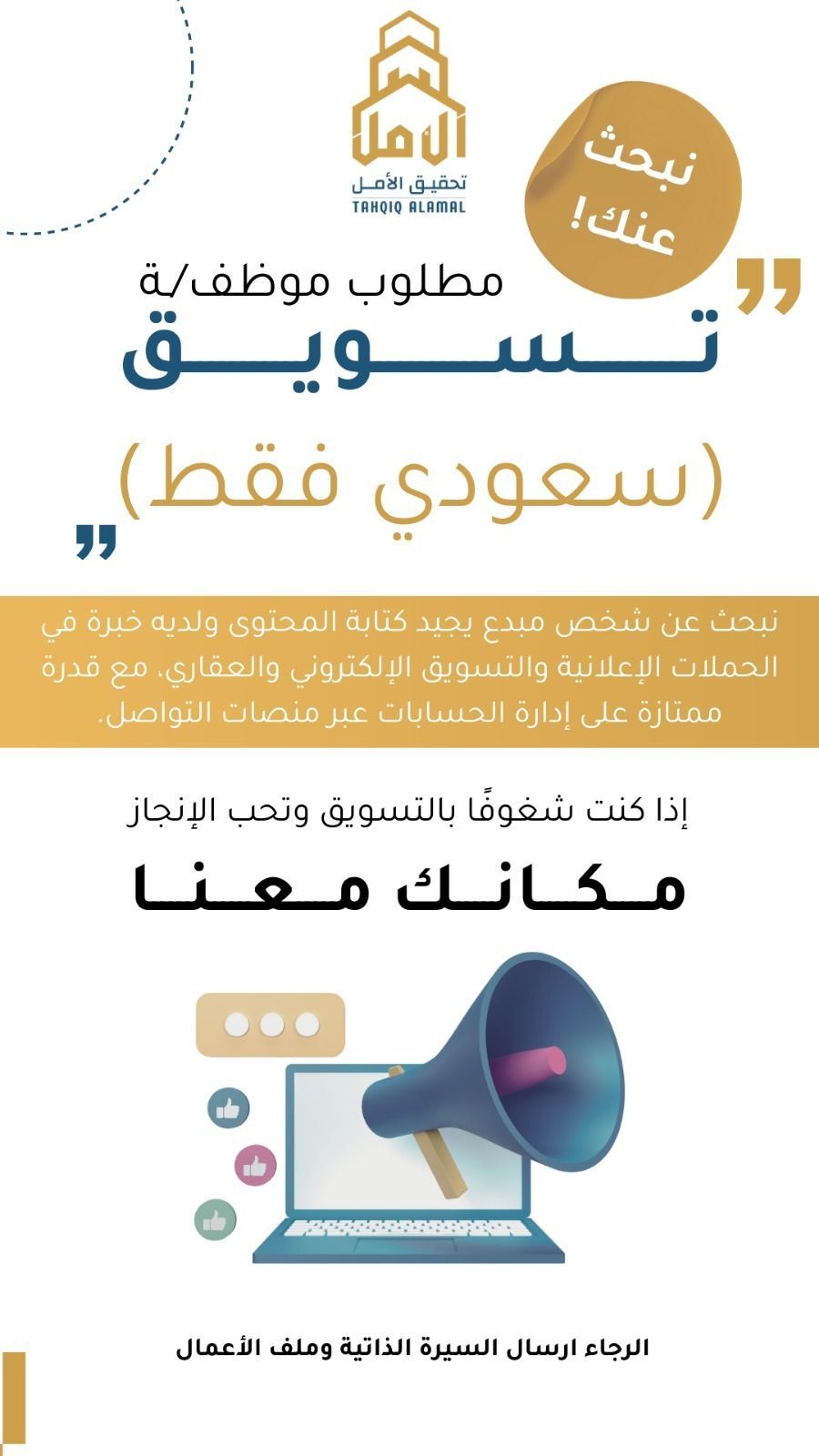 مطلوب لدى شركة مقاولات وتطوير عقاري في جدة حي الواحة موظف / ة تسويق عقاري (سعودي فقط) مبدع ويجيد كتابة المحتوى ولديه خبرة في الحملات الاعلانية والتسويق الالكتروني والعقاري والتسجيل في التأمينات الاجتماعية مع قدرة على إدارة الحسابات عبر منصات التواصل "اذا كنت شغوفا بالتسويق وتحب الانجاز" مكانك معنا للتواصل عبر الواتساب الرقم أعلاه