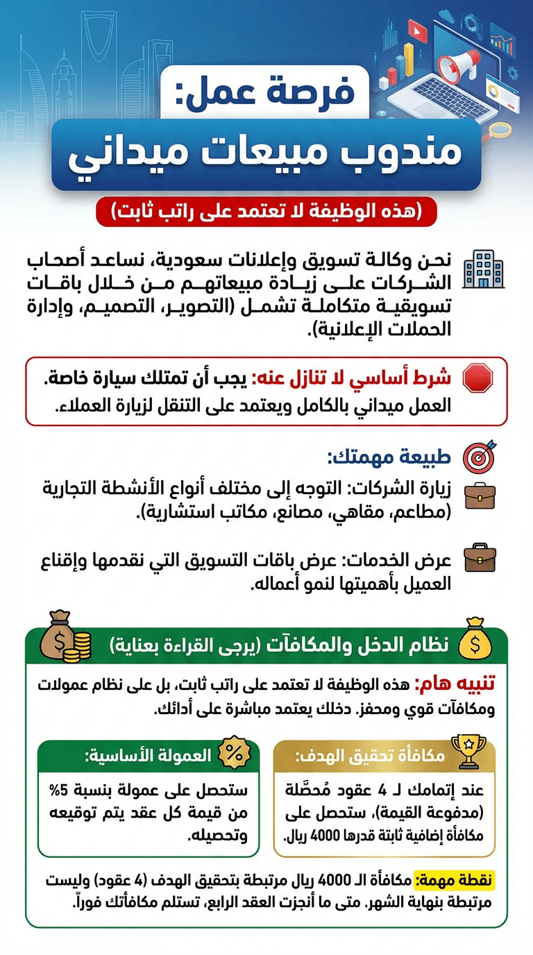 فرصة عمل ممثل مبيعات جدة حي الصفا فرصة عمل ممثل مبيعات (عمولة + مكافآت) عمل ميداني يشمل زيارة جميع أنواع الشركات، وعرض خدماتنا في التسويق والاعلان بنظام مالي مرن يكافئ اجتهادك الحقيقي. الدخل 5% عمولة من كل عقد بعد التحصيل. 4000 ريال مكافأة عند تحقيق 4 عقود محصلة. 2% زيادة على أي عقد بعد العقد الرابع. المكافأة مرتبطة بتحقيق 4 عقود فقط وليس بتاريخ الشهر. في حال تأخر اكمال الهدف لبضعة أيام بعد