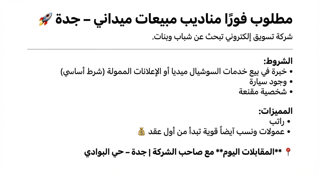 مطلوب فورا مناديب مبيعات ميداني - جدة شركة تسويق الكتروني تبحث عن بنات وشباب لديهم خبرة في بيع خدمات التسويق الالكتروني. الشروط خبرة في بيع خدمات السوشيال ميديا أو الاعلانات الممولة هذا شرط أساسي - وجود سيارة - شخصية مقنعة المميزات راتب - عمولات ونسب أيضا قوية تبدأ من أول عقد المقابلات اليوم مع صاحب الشركة جدة - حي البوادي