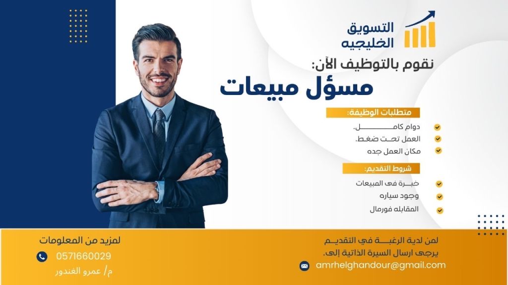 مطلوب للتوظيف الآن مسؤول مبيعات لشركة التسويق الخليجية دوام كامل خبرة في المبيعات / يشترط وجود سيارة - العمل في جدة - المقابلة فورمان للتواصل وارسال CV مسؤول التوظيف أ عمرو الغندور - جدة - الروضة - شارع سعود الفيصل