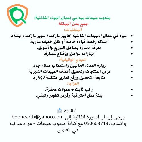 يوجد لدينا شاغر وظيفي بمسمى مندوب مبيعات ميداني لدى شركة بركة الأرض في حال اهتمامك، نأمل تزويدنا بالسيرة الذاتية واتساب على الرقم 50 603 7137 تحياتي