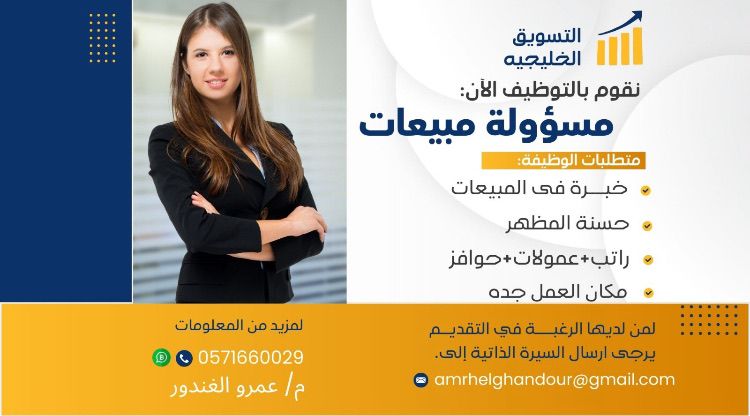 لشركة عالميه مطلوب مسؤولة مبيعات لبقة تجيد التعامل مع العملاء ولديها قدرة على الاقناع جدة حي الروضة