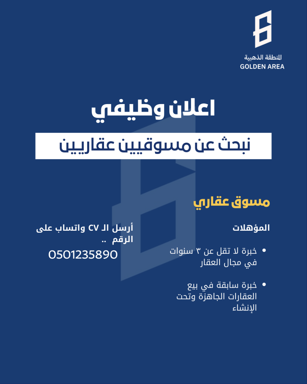 اعلان وظيفي - مسوق / مبيعات عقارية نبحث عن مسوق عقاري مميز للانضمام الى فريقنا، يشترط توفر الخبرة في بيع العقارات الجاهزة وتحت الانشاء. المؤهلات والمتطلبات خبرة سابقة في بيع العقارات الجاهزة وتحت الانشاء (شرط أساسي) القدرة على التواصل مع العملاء وإقناعهم - معرفة بأساسيات السوق العقاري - حي الروضة الجدية والالتزام في العمل أرسل أل CV