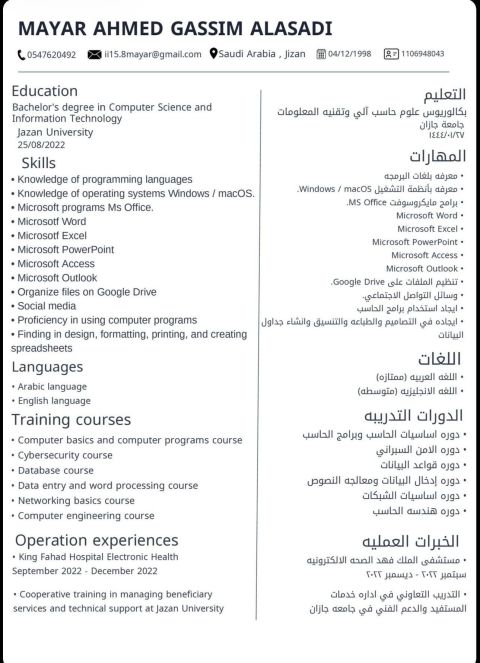 سعودية ابحث عن وظيفة في أي مجال تخصص بكالوريوس حاسب عندي خبرة ادرية، استقبال، مبيعات
