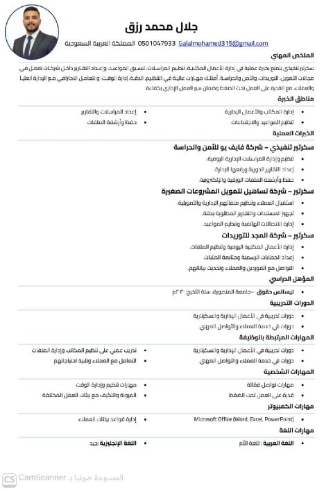 محمد حماد عبد الحميد. حاصل على ليسانس حقوق عام 2023. العمر 26 عام. اللغة الانجليزية جيد. اقامتي سارية. الوظائف المستهدفة / موظف اداري. مساعد اداري. موظف استقبال. موظف ادخال بيانات. منسق اداري. موظف شؤون موظفين. سكرتير / تنفيذي