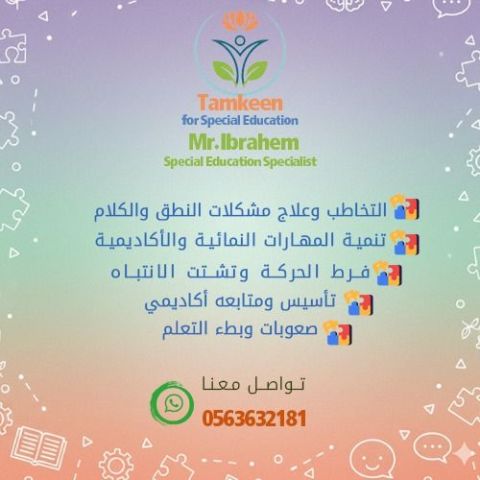 أخصائي التخاطب والتربية الخاصة. تخاطب وعلاج عيوب النطق والكلام. تنمية المهارات النمائية والأكاديمية. فرط الحركة وتشتت الانتباه. تعديل السلوك. تأسيس ومتابعة أكاديمي. صعوبات وبطء التعلم. تواصل معنا للاستفادة من عروض ديسمبر