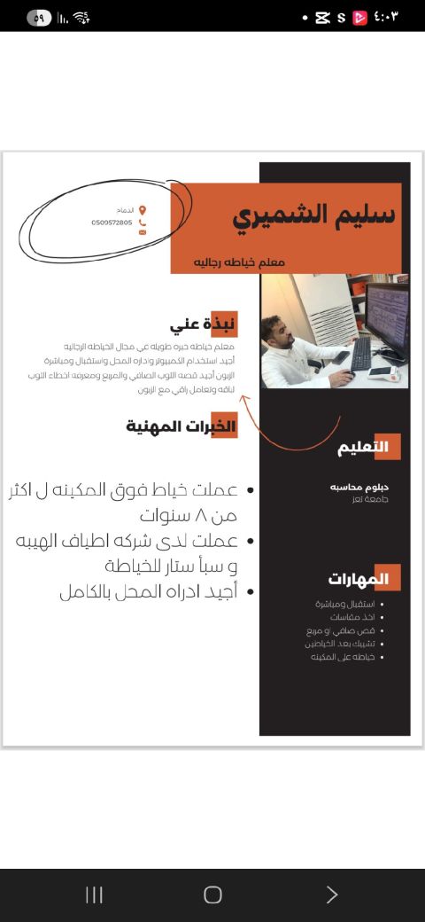 أنا معلم خياطة استقبال زبون وأخذ مقاسات قصه صافي أو مربع لباقة وتعامل زين في الكلام مع الزبائن أجيد استخدام جهاز الكمبيوتر