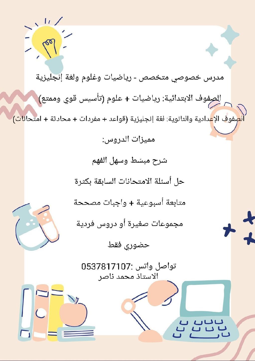 مدرس لغة انجليزيه خبرة 4 سنين في المجال كما أجيد تعليم المواد العلمية مثل الرياضيات والعلوم للابتدائي فقط، خريج دبلوم عالي للغة الانجليزية. للطلب يرجى التواصل معي على الرقم الآتي