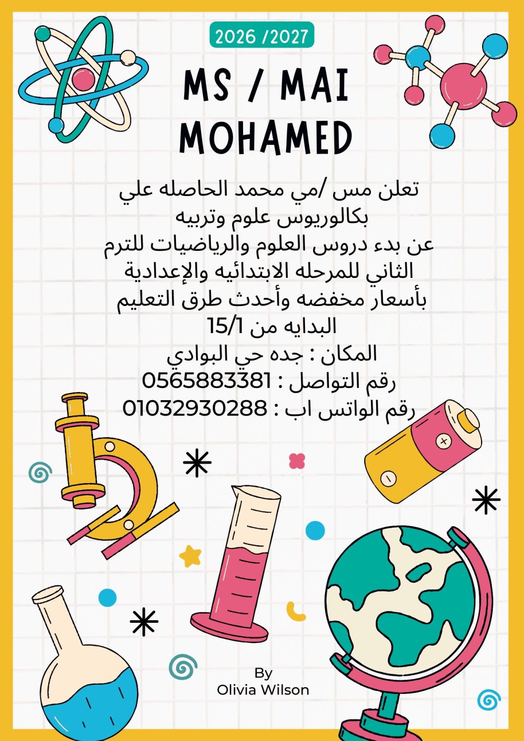 أنا مس مي محمد مصريه مقيمة في جدة حي البوادي معي بكالوريوس العلوم والتربية أدرس العلوم وساينس للمرحلة الابتدائيه والاعداديه