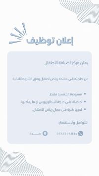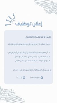 اعلان توظيف يعلن مركز لضيافة الاطفال عن حاجته الى معلمة رياض اطفال وفق الشروط التالية سعودية الجنسية فقط. حاصلة على درجة البكالوريوس أو ما يعادلها. لديها خبرة في مجال رياض الاطفال. للتواصل والاستفسار جدة - يعلن مركز لضيافة الاطفال عن حاجته الى أخصائية تخاطب ونطق وفق الشروط التالية أن تكون سعودية الجنسية أو زوجة مواطن أو أم مواطن. حي السليمانية