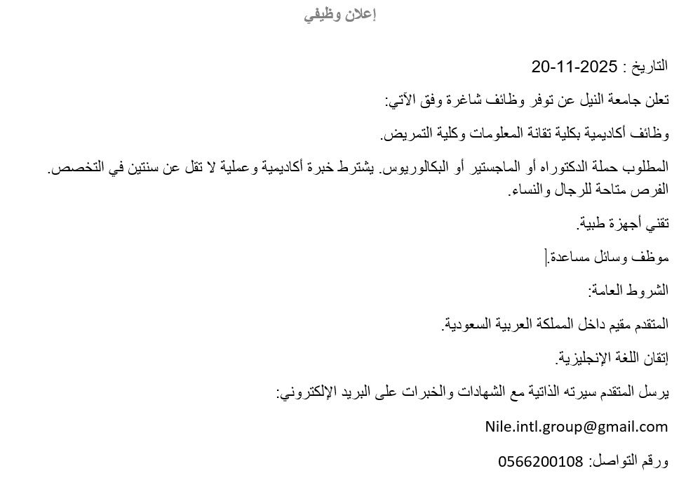 تعلن جامعة بمحافظة جدة - حي المروة عن توفر وظائف شاغرة وفق الآتي وظائف أكاديمية بكلية تقانة المعلومات وكلية التمريض. المطلوب حملة الدكتوراه أو الماجستير أو البكالوريوس، ويشترط خبرة أكاديمية وعملية لا تقل عن سنتين في التخصص. الفرص متاحة للجنسين. تقني اجهزة طبية، موظف وسائل مساعدة. الشروط العامة المتقدم مقيم داخل السعودية. اتقان اللغة الانجليزية. يرسل المتقدم سيرته الذاتية مع الشهادات