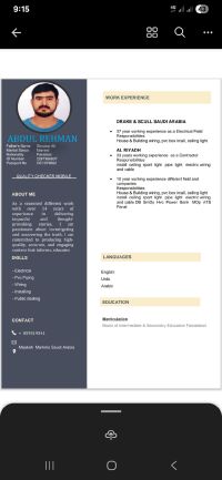 فني كهربائي عبدالرحمن باكستاني 14 سنة شغال كهربائي 8 سنة شغال شركة درك سكل انر نشنل ارفع شغال كايبل تره كايبل ترهنك كايبل تره منش لوحات تبلو ن تره منش Mdp smdp Hvc capstet Bank Ats panal تره منش pvc Emt Rgs pipeing 7 سنة شغال مقاول بيت فيلا شقة عمارة شغال تأسيس وتشتيب صيانة أنا خبر ره 14 سنة سعودي عربية شغال كهربائي صيانة جديد وقديم أبغى شغال صيانة مكة المكرمة راتب 4500