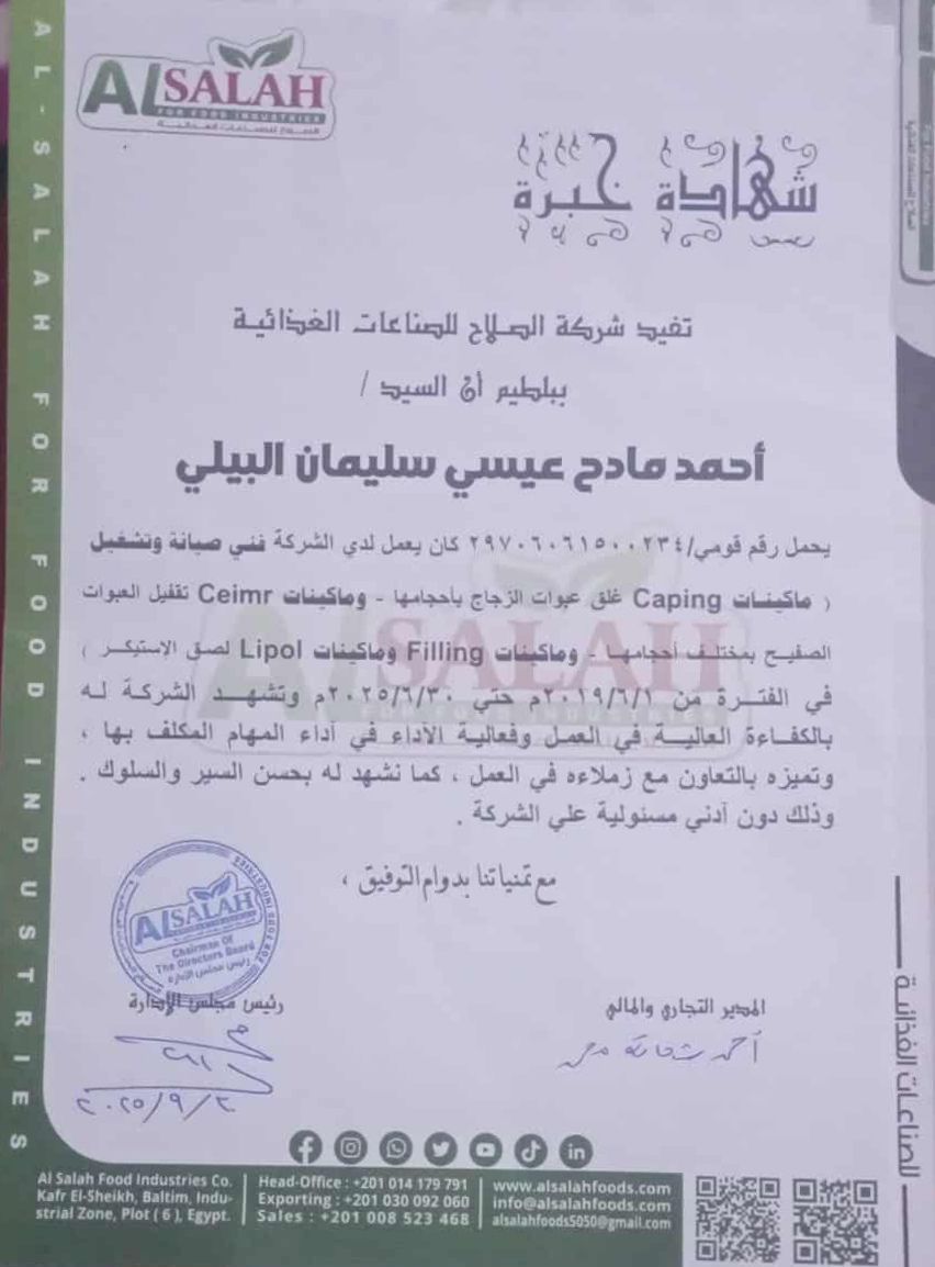 أنا فني صيانة وتشغيل ماكينات مواد غذائية